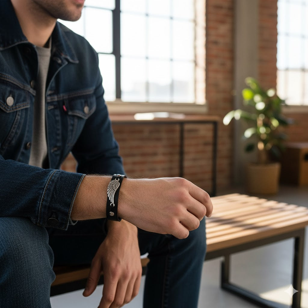 Pulseira de Couro Preta Asa de Anjo - Prata Velha é perfeita para você que quer um acessório eclético e deseja expressar sua fé no dia a dia.